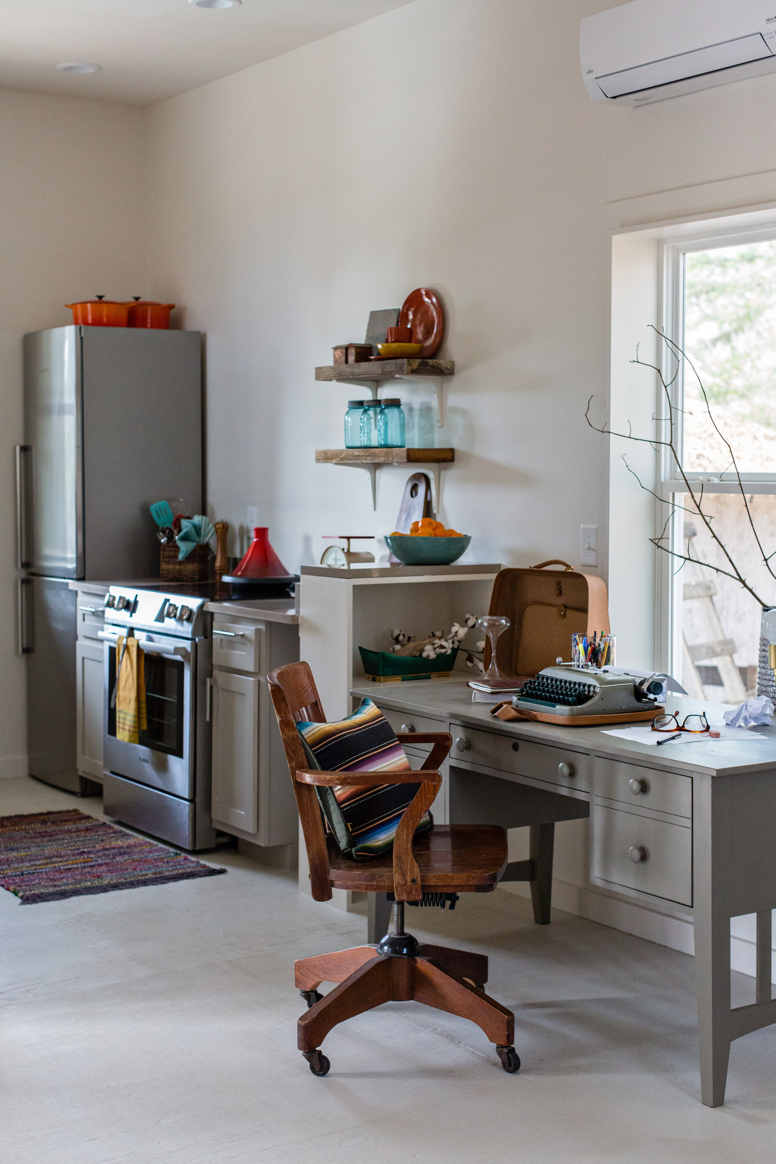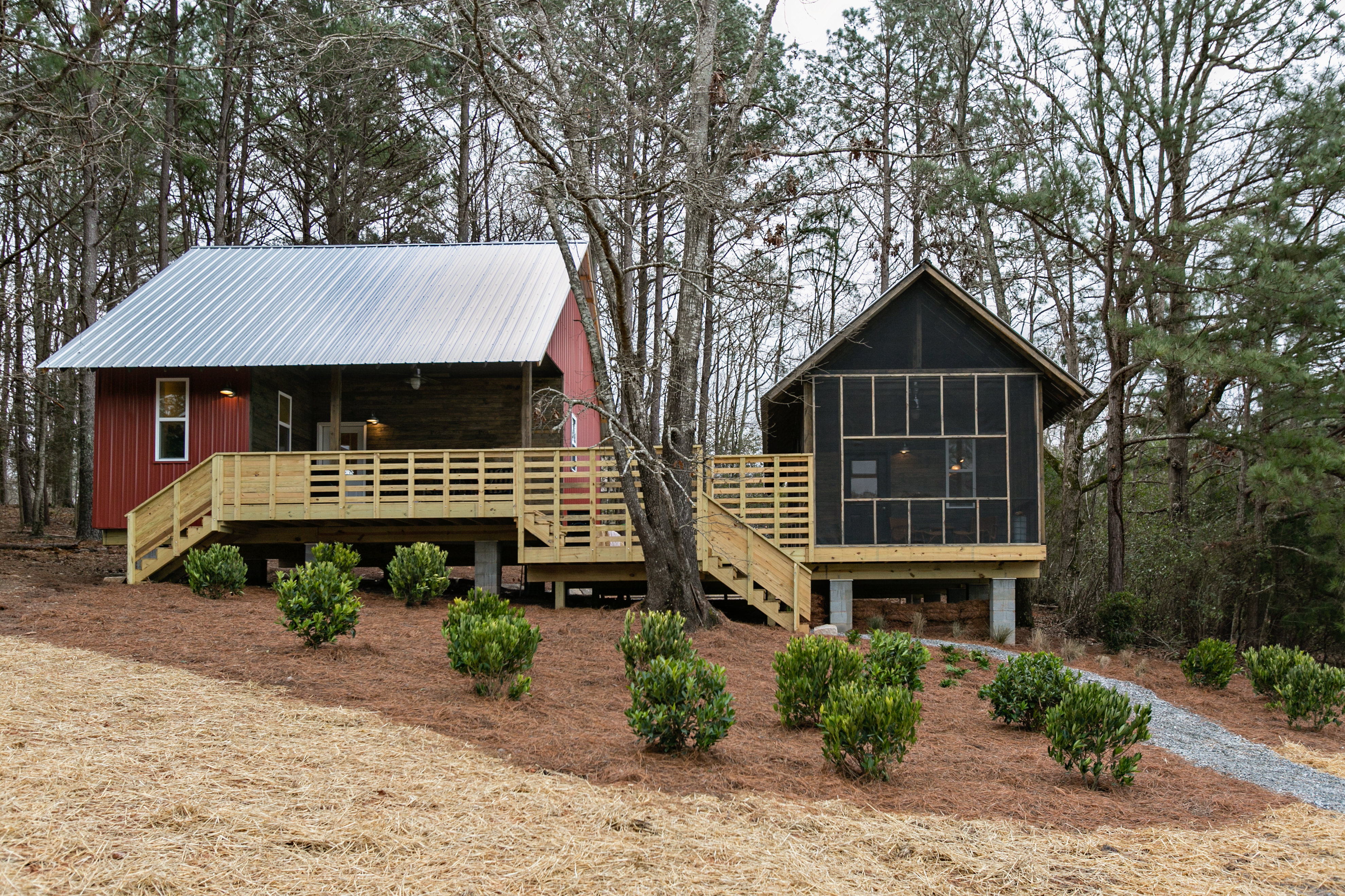 View More: http://jashley.pass.us/serenbe2016Because of them, the cottage turned out amazingly charming. Temporary artist housing has a reputation for being spartan but both area very warm and welcoming. Connected by shared deck meant to inspire collaboration, the writer’s space is very 50’s retro and the painter’s quarters is a bit more contemporary. In the writer’s cottage, the desk, donated by a Serenbe resident, faces the woods and an old pie safe works well with quartz countertops. The painter’s cottage is a bit looser, with lots of open spaces for the artist to configure their own arrangement, and a gorgeous end table made from reclaimed mill beams.