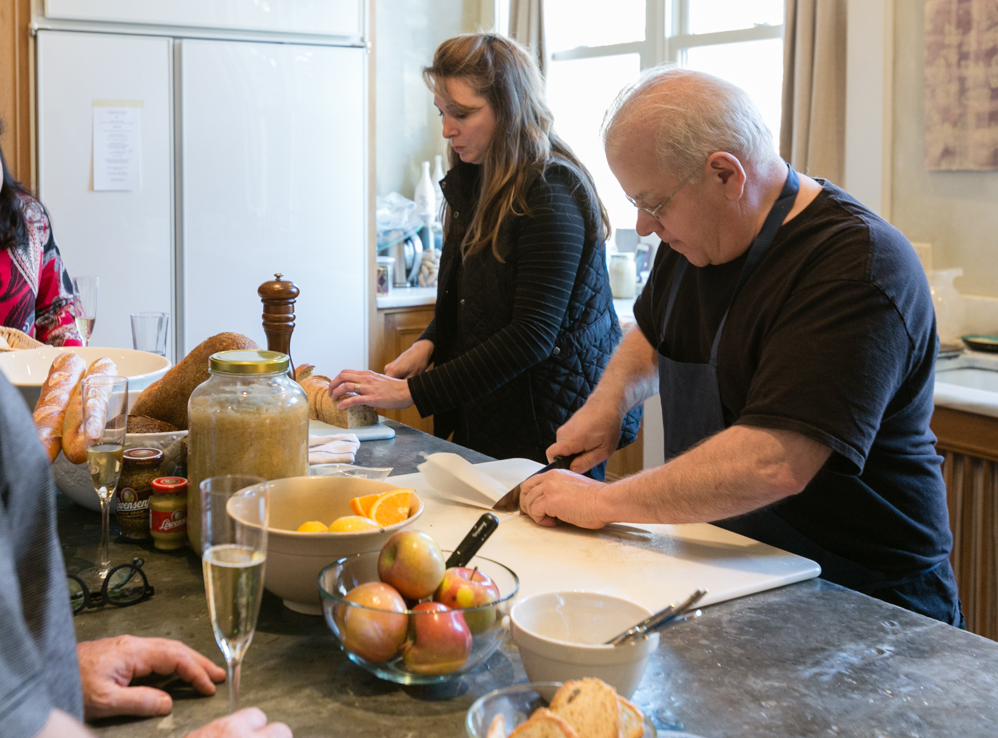 Months before his visit, Gerry told me he wanted to do an Alsatian theme to expose participants to recipes from the French region so heavily influenced by nearby Germany. And did he ever. Gerry brought three types of sausages, three kinds of pork, ham, roasted duck, boiled potatoes, different mustards and a big loaf of potato bread to make bread dumplings.