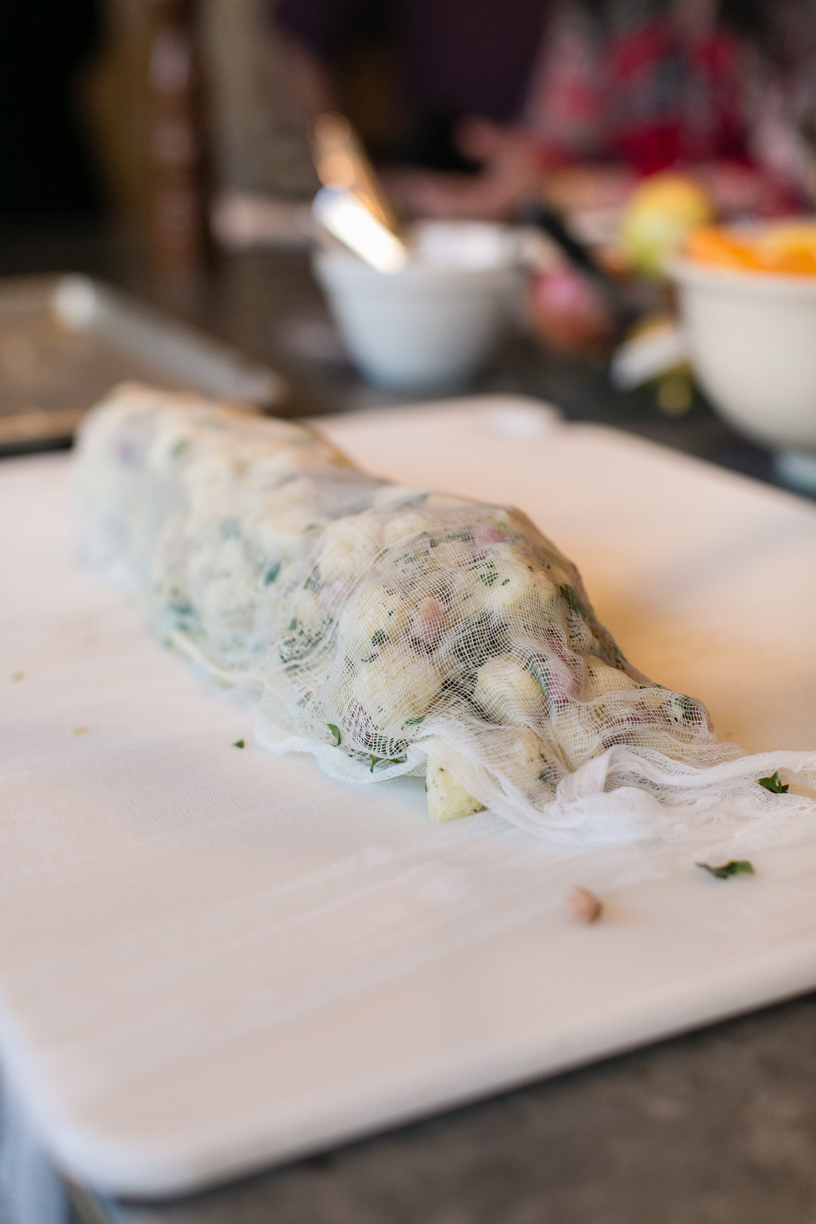 4. Lay out a sheet of 20″ x 24″ cheesecloth. At one end, shape the dumpling mix into a large sausage shape. Tightly roll up and tie off each end with cotton twine.